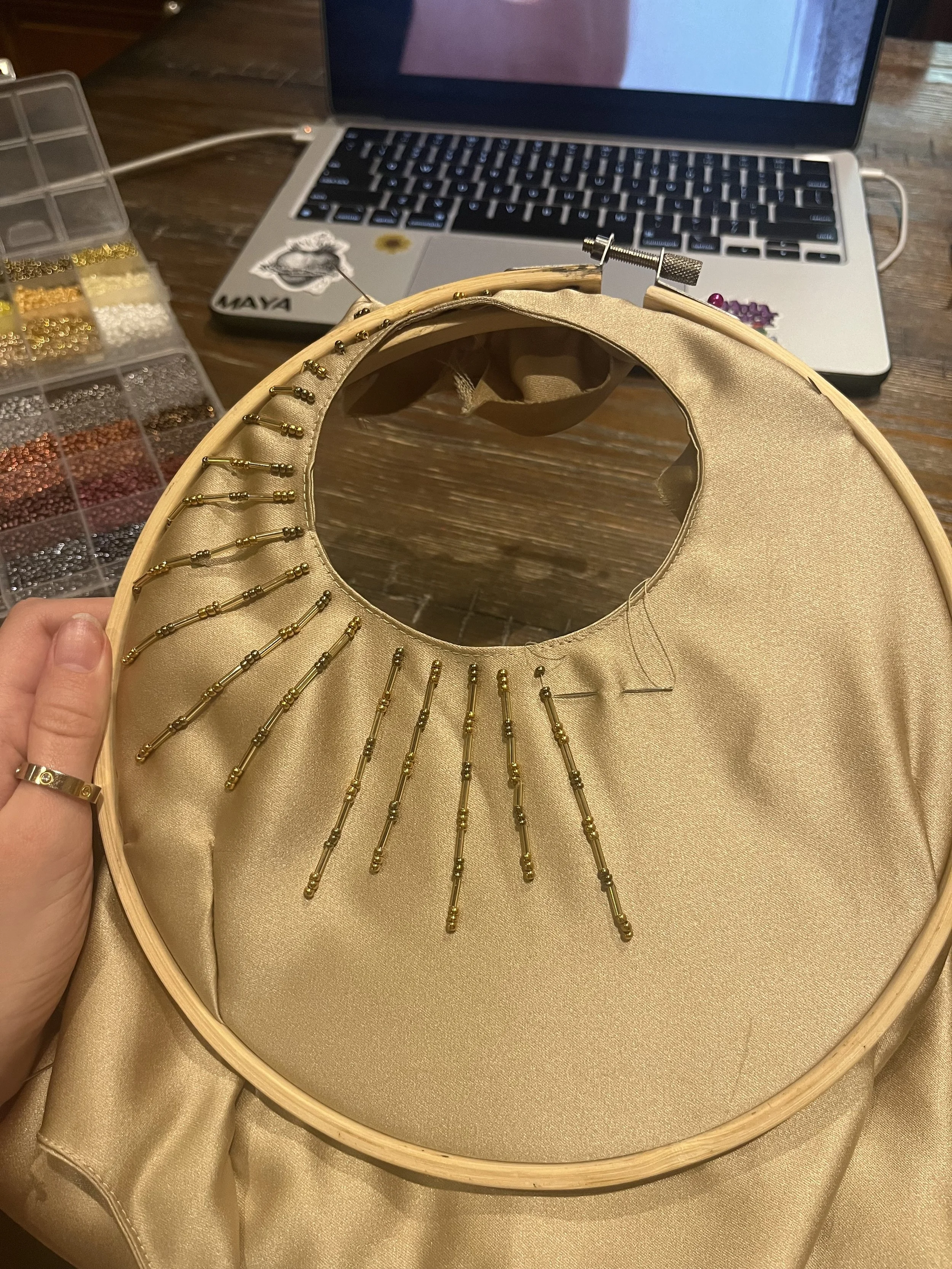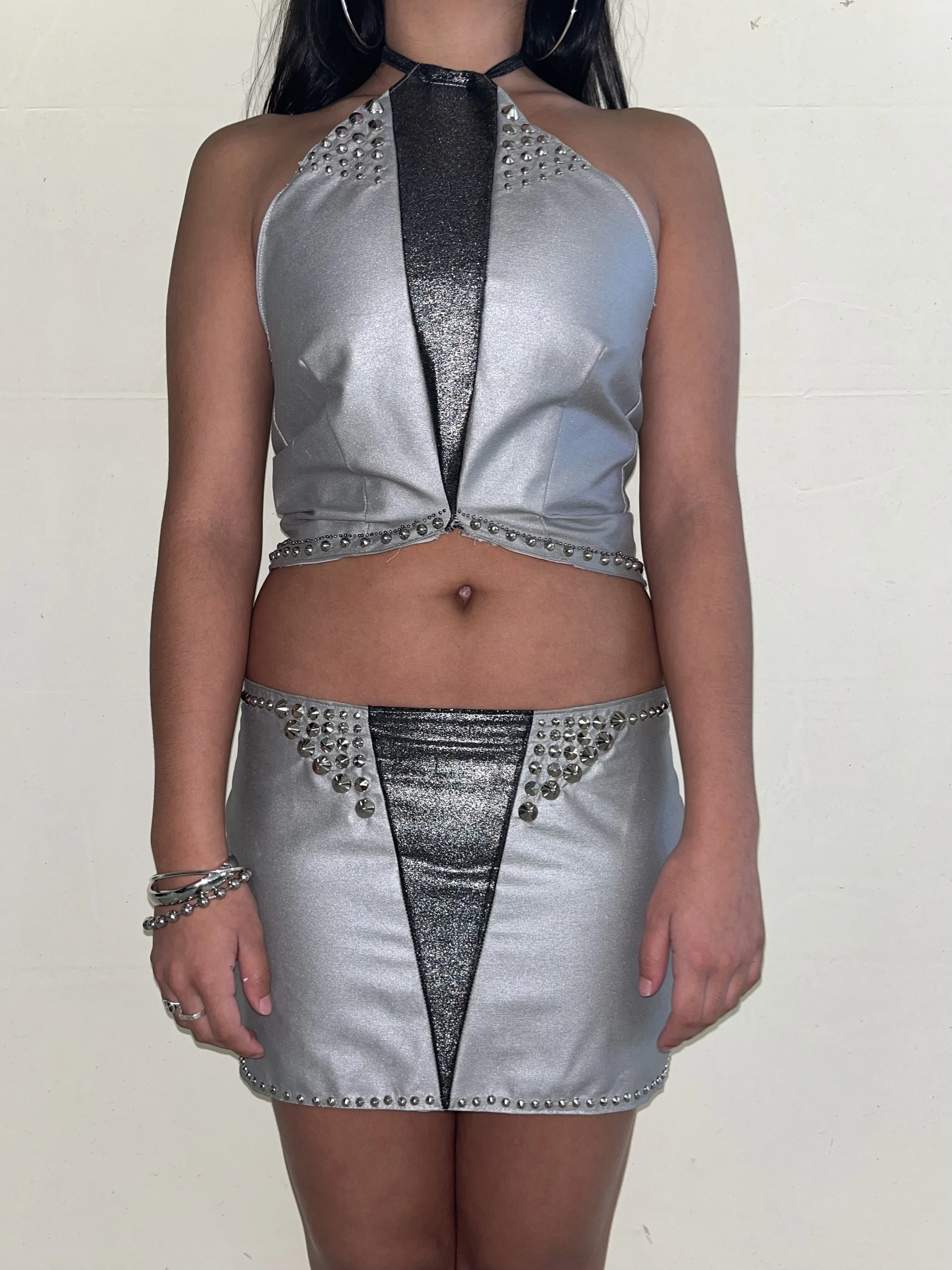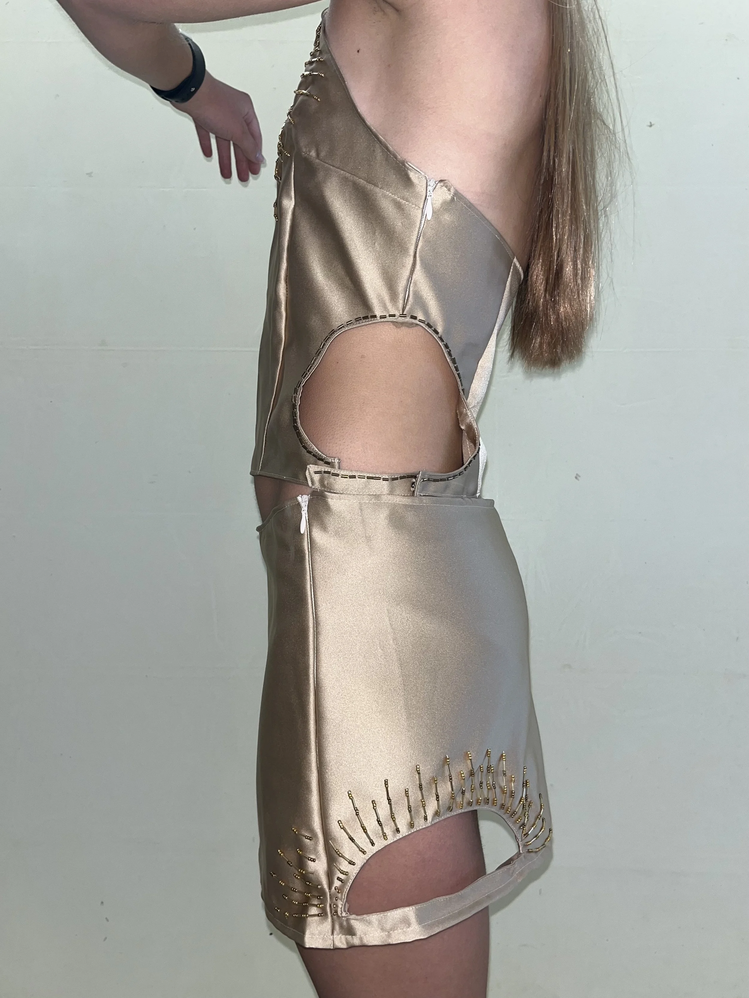 I designed two outfits: a silver and a gold two-piece skirt and top set. Originally inspired by metallics, these designs were reenvisioned to represent opposing natures, with the main idea being the sun and the moon. I channeled this concept into these pieces by focusing on circle and semi-circle cutouts with beaded lines representing the sun’s rays, light, and goldness. Then, with the silver piece, I created a very straight and triangular shape to juxtapose the roundness of the other’s cutouts. I also included studs and made the fabric scrunch in the back and sides of the top to represent the moon’s craters. I was honored to have these pieces chosen by my fashion teacher as a junior to be presented in the end-of-year senior fashion show.