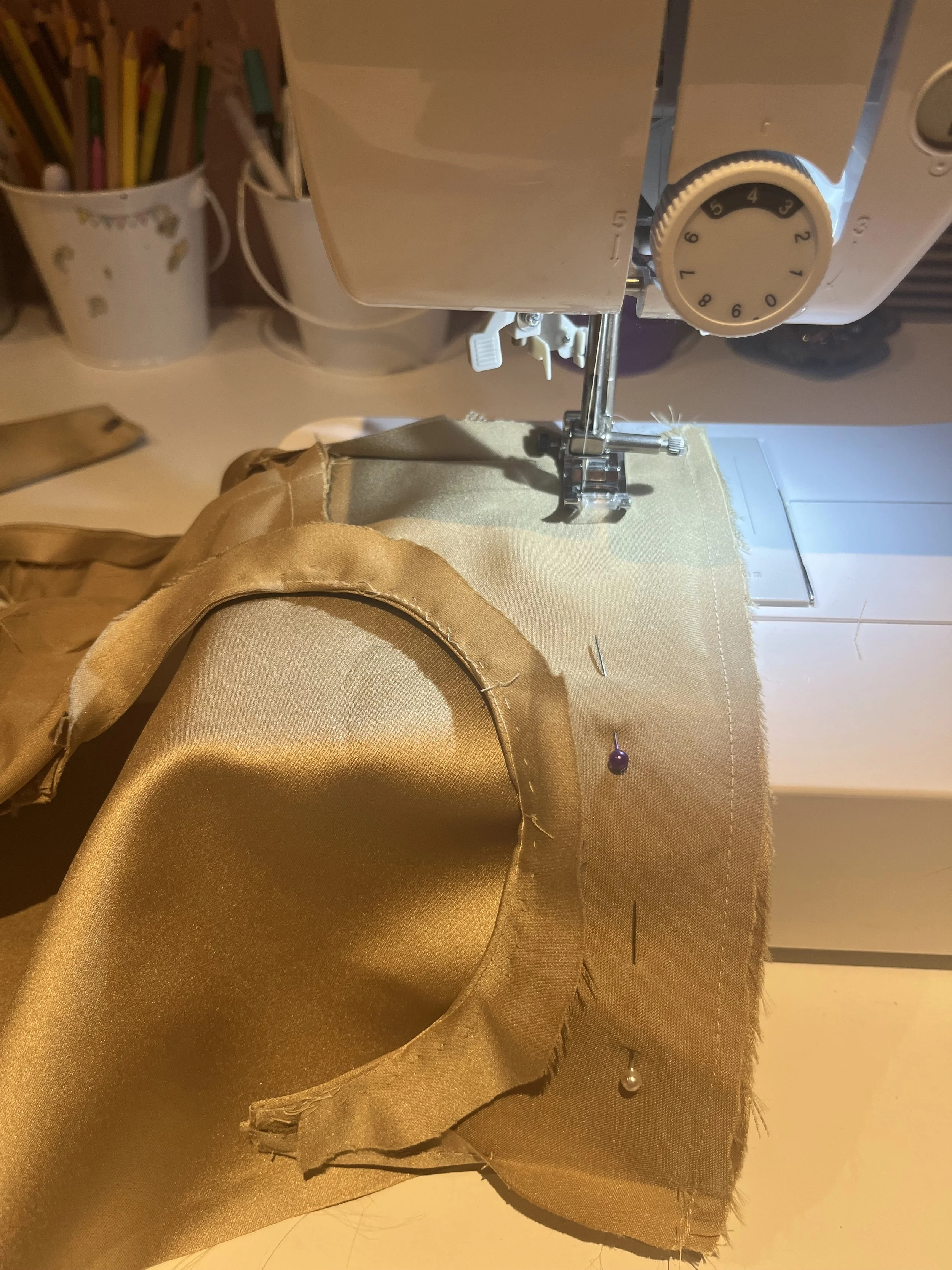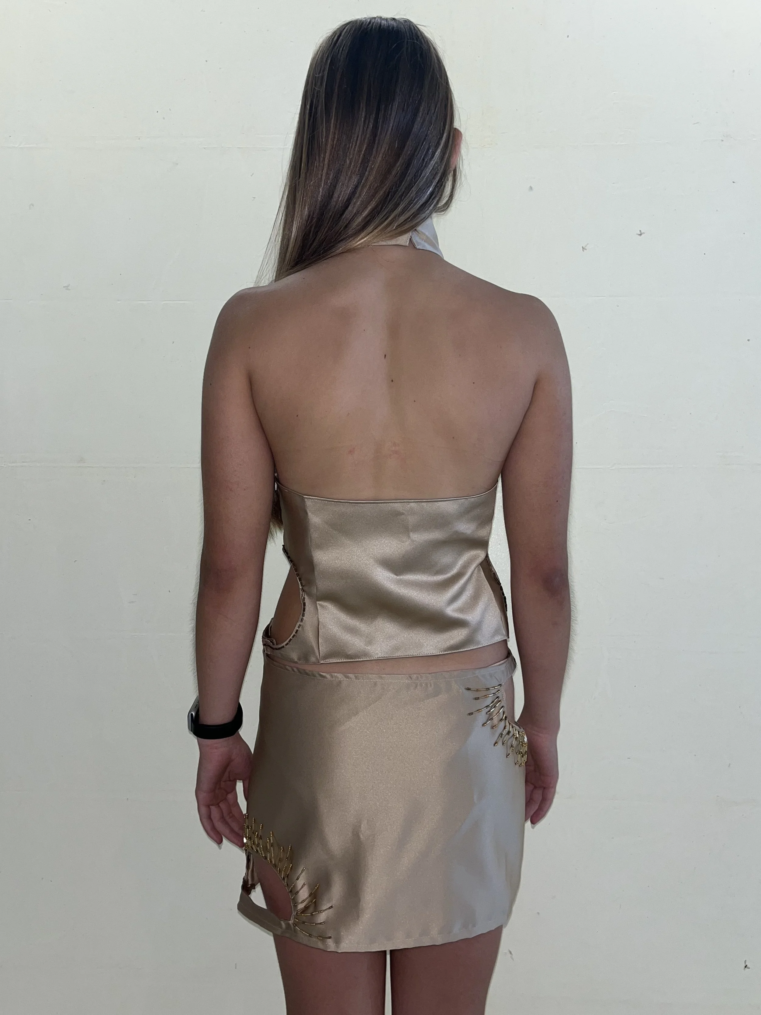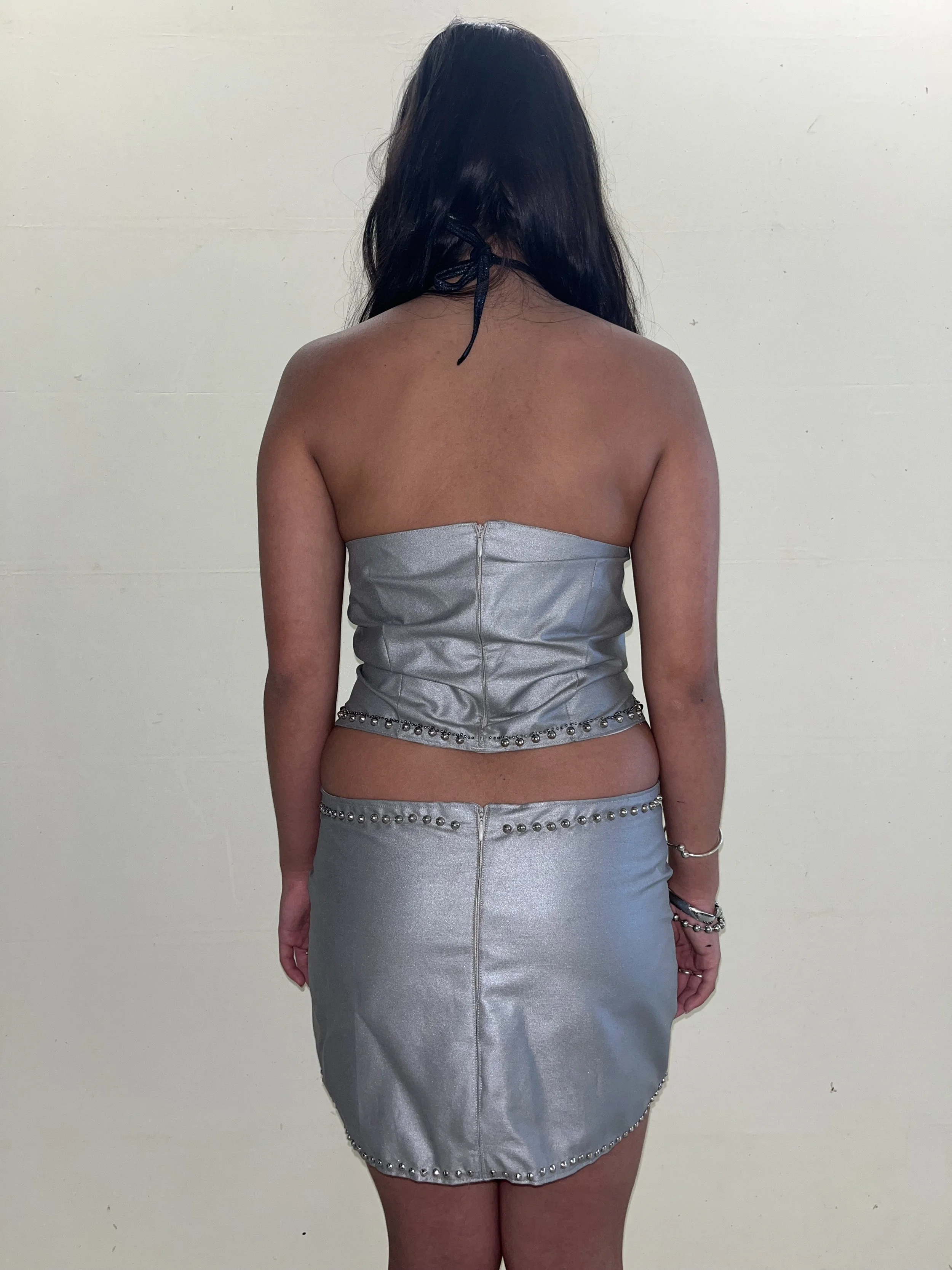 I designed two outfits: a silver and a gold two-piece skirt and top set. Originally inspired by metallics, these designs were reenvisioned to represent opposing natures, with the main idea being the sun and the moon. I channeled this concept into these pieces by focusing on circle and semi-circle cutouts with beaded lines representing the sun’s rays, light, and goldness. Then, with the silver piece, I created a very straight and triangular shape to juxtapose the roundness of the other’s cutouts. I also included studs and made the fabric scrunch in the back and sides of the top to represent the moon’s craters. I was honored to have these pieces chosen by my fashion teacher as a junior to be presented in the end-of-year senior fashion show.